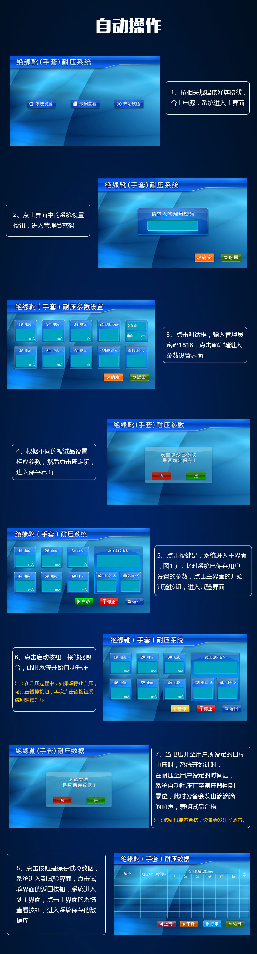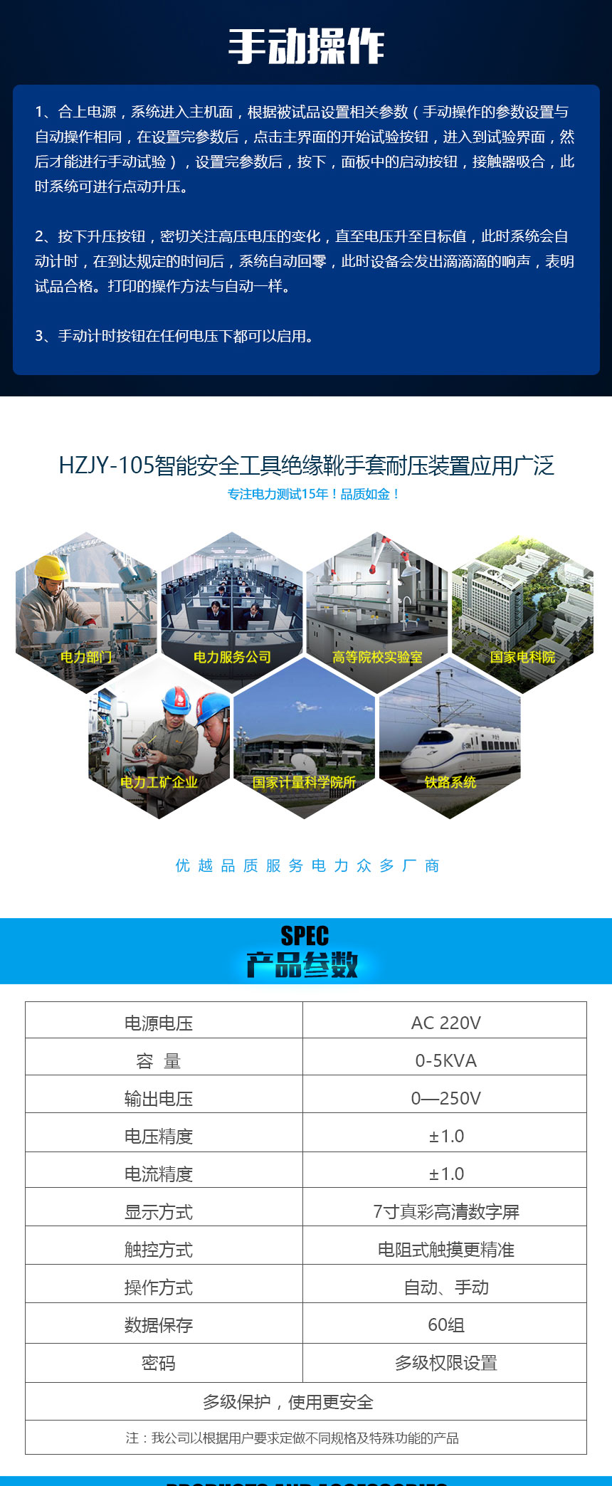 HZJY-105智能安全工具絕緣靴手套耐壓裝置,采用先進的微電子處理技術,全部使用過程可提前進行設置,全中文界面,操作簡單明了。全部測試項目設定后自動進行測試,無須人工干預。