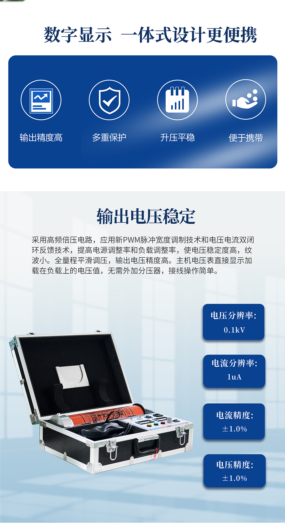 1、輸出電壓穩定:采用高頻倍壓電路,應用新PWM脈沖寬度調制技術和電壓電流雙閉環反饋技術,提高電源調整率和負載調整率,使電壓穩定度高,紋波小。全量程平滑調壓,輸出電壓精度高。主機電壓表直接顯示加載在負載上的電壓值,無需外加分壓器,接線操作簡單。電壓分辨率0.1kV,電流分辨率1uA。