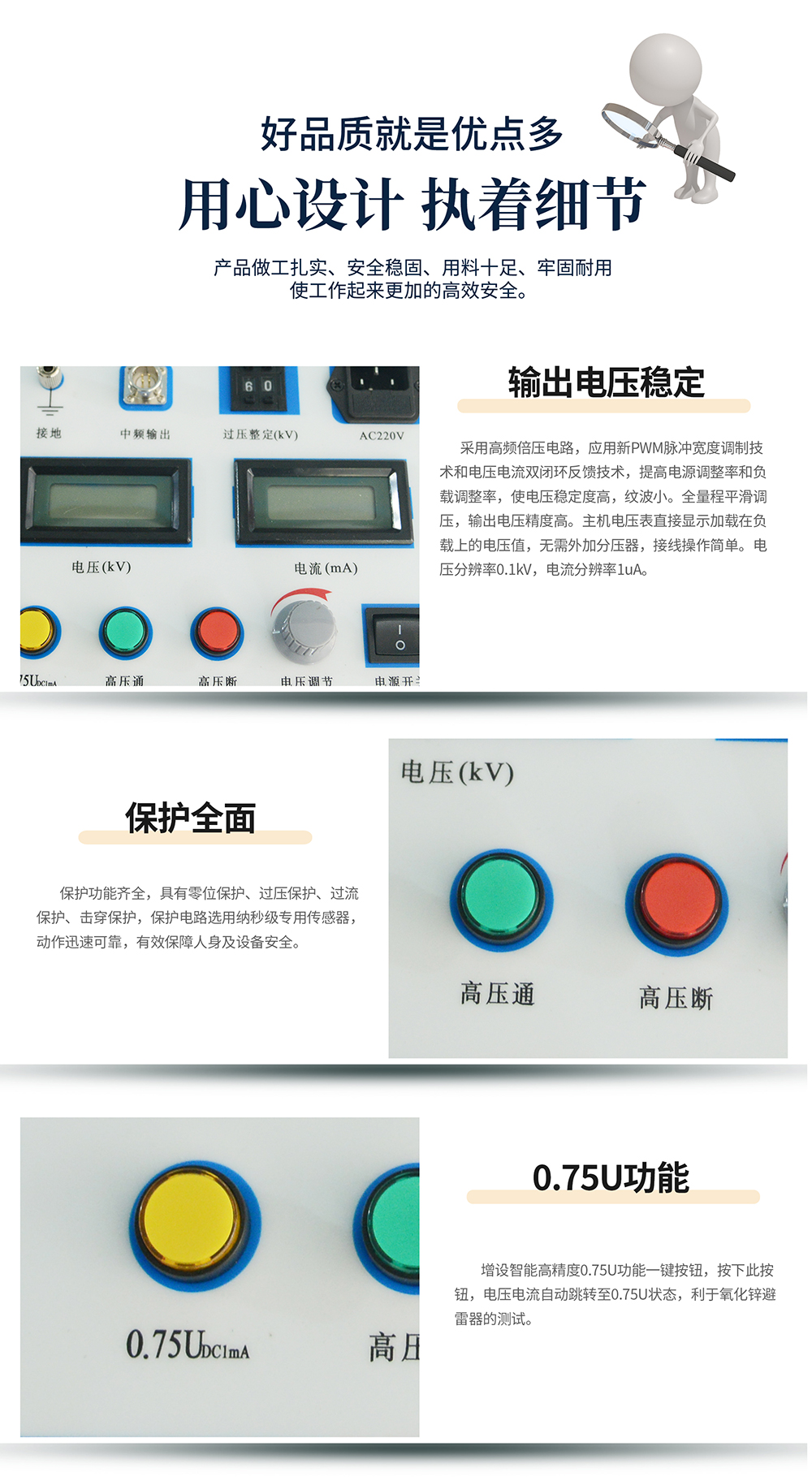 2、保護全面:保護功能齊全,具有零位保護、過壓保護、過流保護、擊穿保護,保護電路選用納秒級專用傳感器,動作迅速可靠,有效保障人身及設備安全。