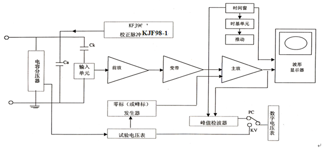 試品Ca在試驗電壓下產生局部放電時,放電脈沖信號經藕合電容Ca送入輸入單元,由輸入單元拾取到脈沖信號,經低噪聲前置放大器放大,濾波放大器選擇所需頻帶及主放大器放大(達到所需幅值與產生零標志脈沖)后,在示波屏的橢圓掃描基線上產生可見的放電脈沖,同時也送至脈沖峰值表顯示其峰值。