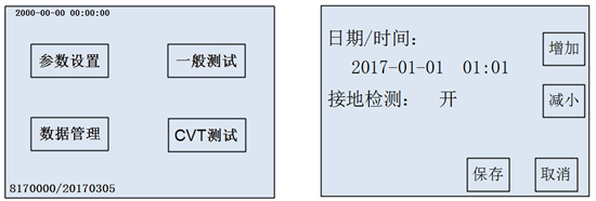 時間設置:打開儀器后直接點擊“參數設置”(如圖5-11)進入時間設置界面。進入時間菜單(如圖5-11)后,點擊想要修改的時間數據項目上,然后再按增加、減小鍵調整相應的“時” 、“分” 、“秒” ,最后點擊保存修改時間設置,點擊取消退出設置并返回主界面。