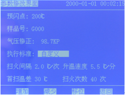 1)在此界面中預閃點、樣品號、氣壓、標準和時間,都可按提示進行調整,修改完成后按【返回】鍵。回到主操作界面。