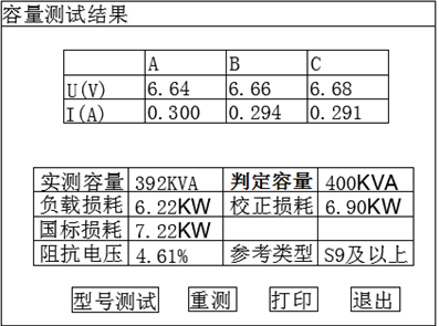 實(shí)測容量:該項(xiàng)顯示實(shí)際測量的變壓器的容量。