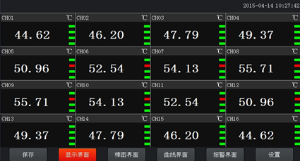 數顯畫面分為64、48、40、32、24、16、8通道數顯畫面(8通道有一個綜合顯示畫面),用戶可通過按設置按鈕進入參數設置選擇通道數目即可實現所需要通道顯示數目的顯示界面。如下圖為16通道顯示界面。