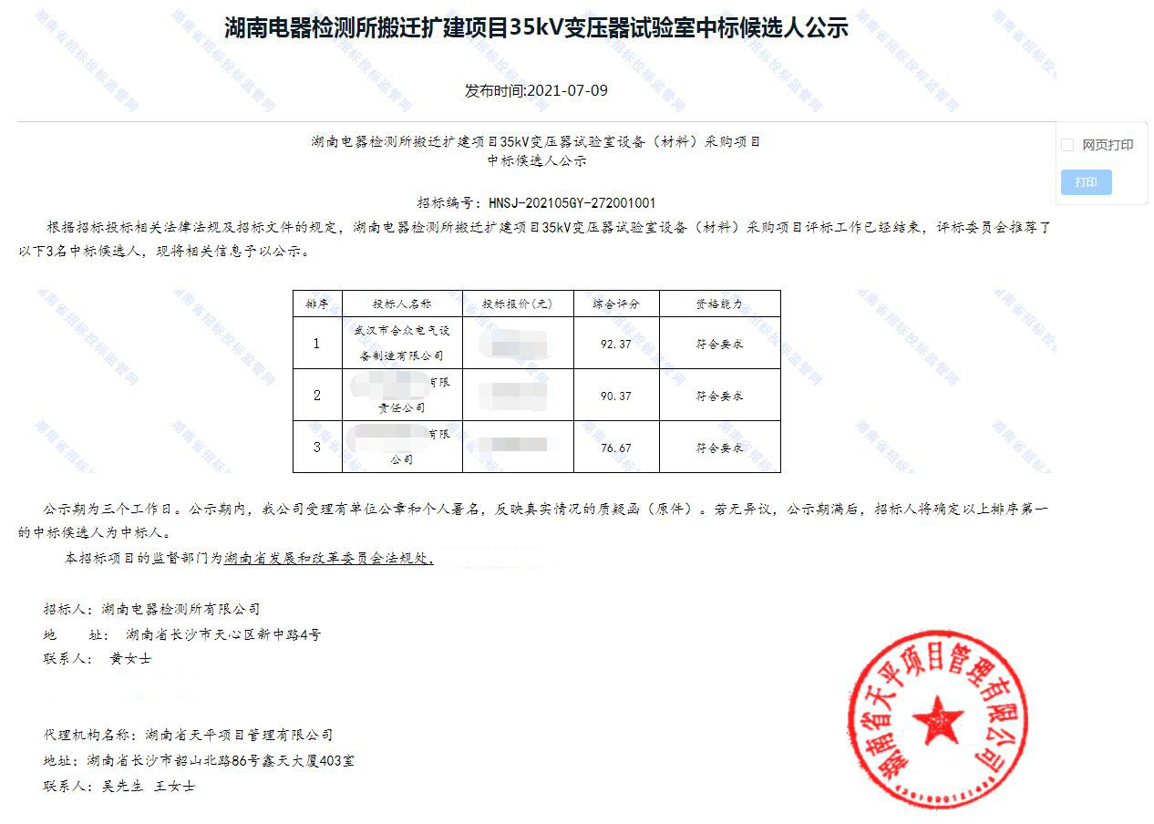 近日湖南電器檢測所35kV變壓器試驗(yàn)室項(xiàng)目招標(biāo)候選結(jié)果公示發(fā)布,根據(jù)招投標(biāo)相關(guān)法律法規(guī)及招標(biāo)文件規(guī)定,湖南電器檢測所35kV變壓器試驗(yàn)室設(shè)備(材料)采購項(xiàng)目評標(biāo)工作已經(jīng)結(jié)束,評標(biāo)委員會推薦的中標(biāo)候選人相關(guān)信息已公示,武漢市合眾電氣設(shè)備制造有限公司以公示排序第一中標(biāo)人中標(biāo)。