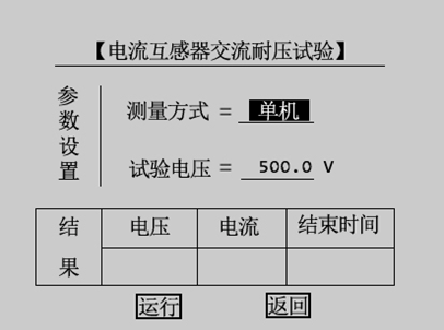 試驗(yàn)電壓:指本次試驗(yàn)交流輸出保持電壓?!皢螜C(jī)”時(shí),儀器默認(rèn)電壓值為500V,內(nèi)置升壓器電壓范圍為(0~1000)V,在AC220V電源輸入情況下最高輸出電壓為600V,在AC380V電源輸入情況下最高輸出電壓1000V。互感器綜合特性測(cè)試儀選用“升壓器”時(shí),儀器默認(rèn)電壓值為1500V,外接升壓器電壓范圍為(0~2500)V。