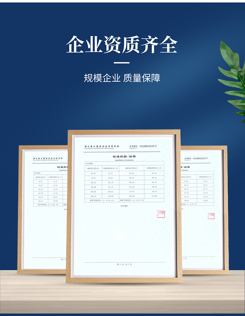 企業產品嚴格按照國際、國家標準及行業規程生產,通過國家、各省級、市級電力研究所、計量中心及電力權威部門的檢測,全面通過ISO9001國際質量管理體系認證、中華人民共和國制造計量器具許可證、GB/T19001-2008質量等管理體系要求。