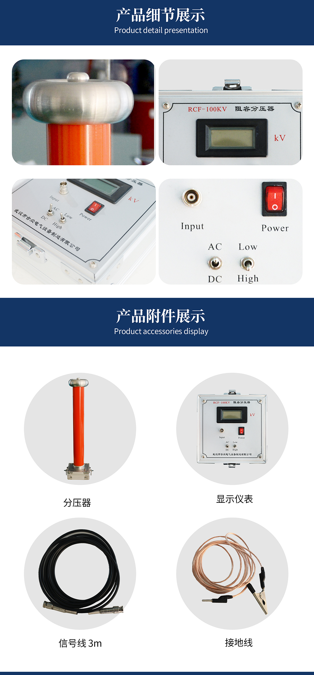 本儀器是由高壓分壓器和低壓顯示儀表構成,高壓分壓器采用美國杜邦填充材料,特種工藝灌封,結構更小,重量更輕,內部局部放電量降低,可靠性更高。不存在漏油問題。工作時高壓分壓器和低壓儀表采用同軸電纜連接,高低壓部分距離較遠,工作安全可靠。
