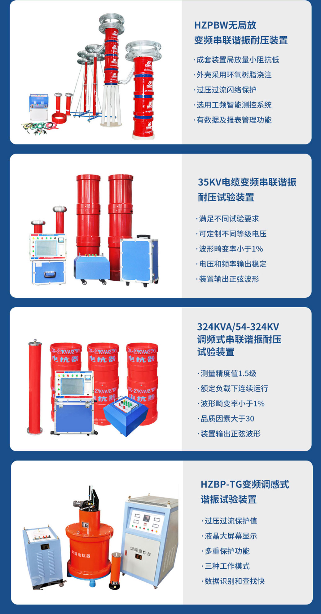 *串聯諧振試驗裝置主要針對交聯電纜、水力發電機、主變、母線、GIS等的交流耐壓試驗,具有較寬的適用范圍,是地、市、縣級高壓試驗部門及電力安裝、修試工程單位理想的耐壓設備。