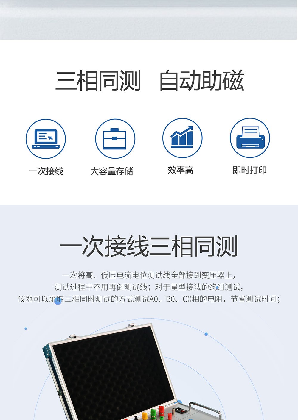 2、對于星型接法的繞組測試,儀器可以采取三相同時測試的方式測試A0、B0、C0相的電阻,節(jié)省測試時間;