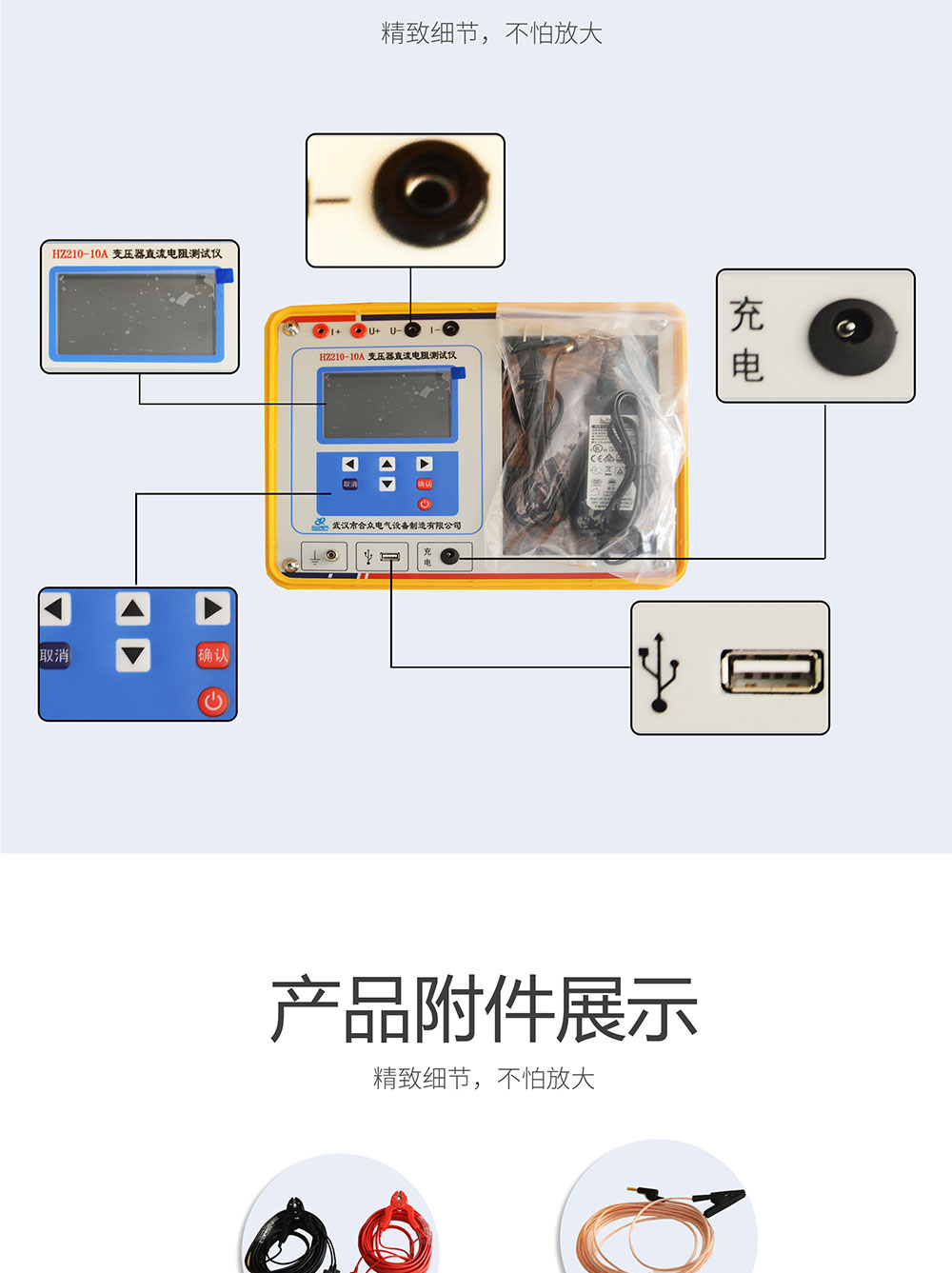 本測試儀器是一款創新型產品,內置大容量鋰電池,儀器與測試線采用機線一體設計,產品體積小巧,便于攜帶。產品不僅適合變壓器、互感器、電抗器等感性試品的測量,而且適合銅排、導線、開關觸點等阻性試品的測量,儀表測試速度快、準確度高。